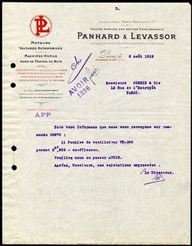 1912 1912. Facture 1912 PANHARD et LEVASSOR Moteurs Voitures Automobiles Machines Outils
