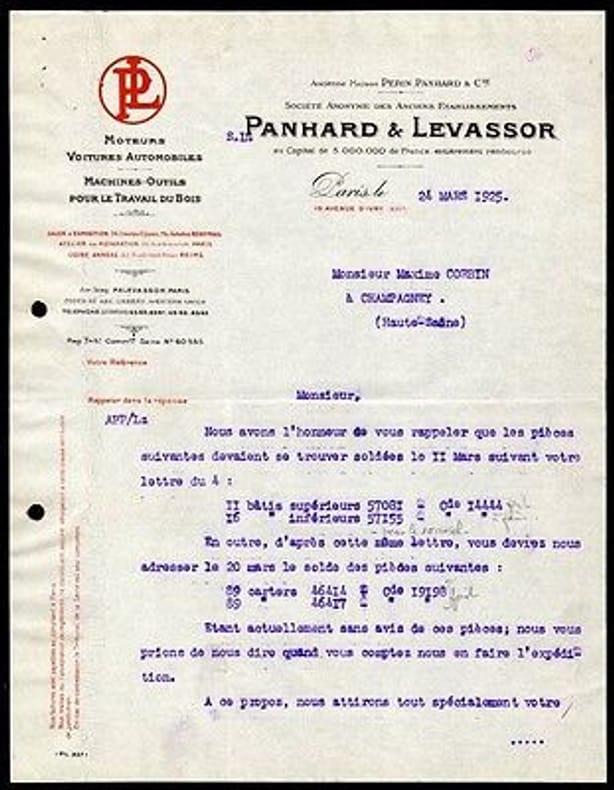 1925 1925. Facture 1925 PANHARD et LEVASSOR Moteurs Voitures Automobiles Machines Outils