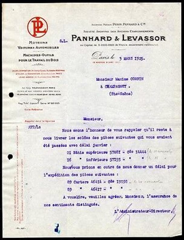 1925 1925. Facture 1925 PANHARD et LEVASSOR Moteurs Voitures Automobiles Machines Outils