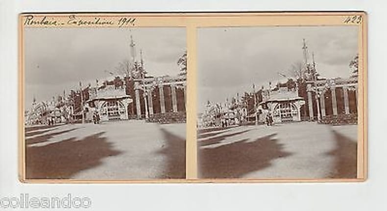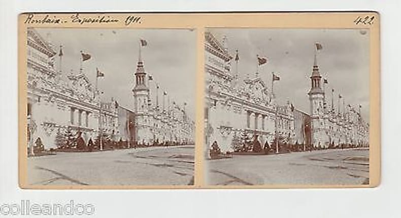 1911 1911. Ancien carton stéréoscopique de 1911 celui-ci à la particularité de comporter 2 clichés / photos collées sur le RECTO ET VERSO :. - Recto : 59 Roubaix Expo 1911 Le grand palais des industries diverses. - Verso : 59 Roubaix Expo 1911 vue avec un stand brasserie/tabac
