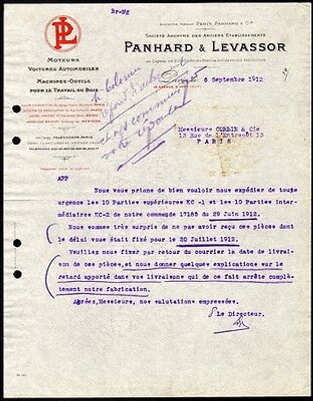 1912 1912. Facture 1912 PANHARD et LEVASSOR Moteurs Voitures Automobiles Machines Outils