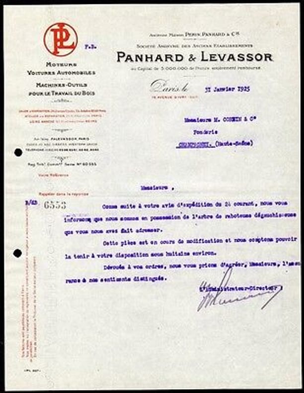 1925 1925. Facture 1925 PANHARD et LEVASSOR Moteurs Voitures Automobiles Machines Outils