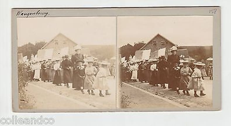1910 1910. Ancien carton stéréoscopique vers 1910 celui-ci à la particularité de comporter 2 clichés / photos collées sur le RECTO ET VERSO :. - Recto : Alsace Wangenbourg défilé religieux. - Verso : Alsace Wangenbourg défilé religieux (enfants)