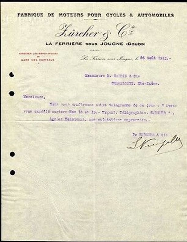 1912 1912. Facture 1912 ZURCHER & Cie Fabrique moteurs pour Cycles et Automobiles Doubs