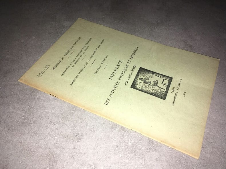 2eme édition de 1962, largement augmentée par rapport à celle de 1952 Contents, Chapitres : Préface du docteur Pierre Mathieu, iv, Texte, 299 pages - Introduction - Influence des activités physiques et sportives sur l'organisme - Organisation administrative technique et pratique du contrôle médical des activités physiques et sportives - Principaux textes officiels relatifs à l'organisation du contrôle médical des activités physiques et sportives legeres traces de pliures sur les bords et les coins de la couverture sans gravité, infimes petites taches au coin inférieur du plat supérieur et sur le bord du plat inférieur sur le bord droit du plat supérieur, intérieur frais et propre, coins à peine cornés en début d'ouvrage, quelques passages soulignés proprement en bleu sur moins d'une dizaine de pages au centre de l'ouvrage, cela reste un bon exemplaire de lecture