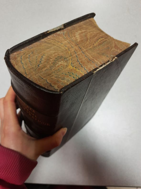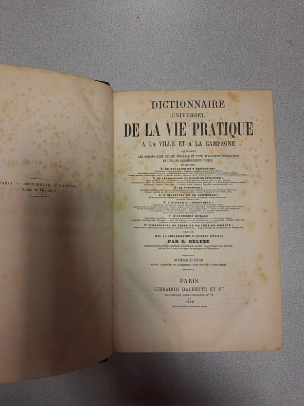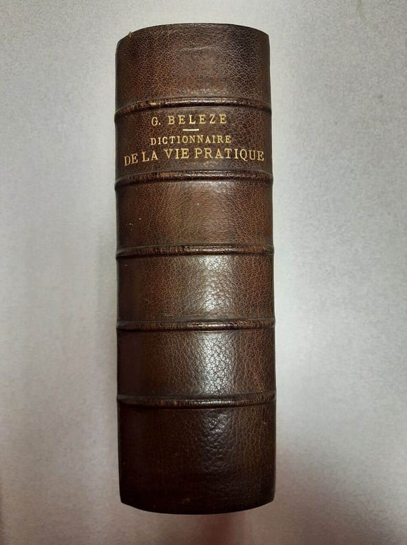 1890, librairie Hachette et Cie, petit in-4 demi-cuir noir de 1954 pages, titrage et fleurons dorés sur dos à 4 nerfs, Dictionnaire universel de la vie pratique à la ville et à la campagne, contenant les notions d'une utilité générale et d'une application journalière et tous les renseignements usuels en matière: 1. De religion et d'éducation. 2. De législation et d'administration. 3. De Finances. 4. D'industrie et de commerce. 5. D'économie domestique. 6. D'économie rurale. 7. D'exercices de corps et de jeux de société, 7ème édition | Etat : état moyen, plusieurs accrocs sur le dos avec gros manque, coins, mors et coiffes frottés, tranches salies (Ref.: ref88501)