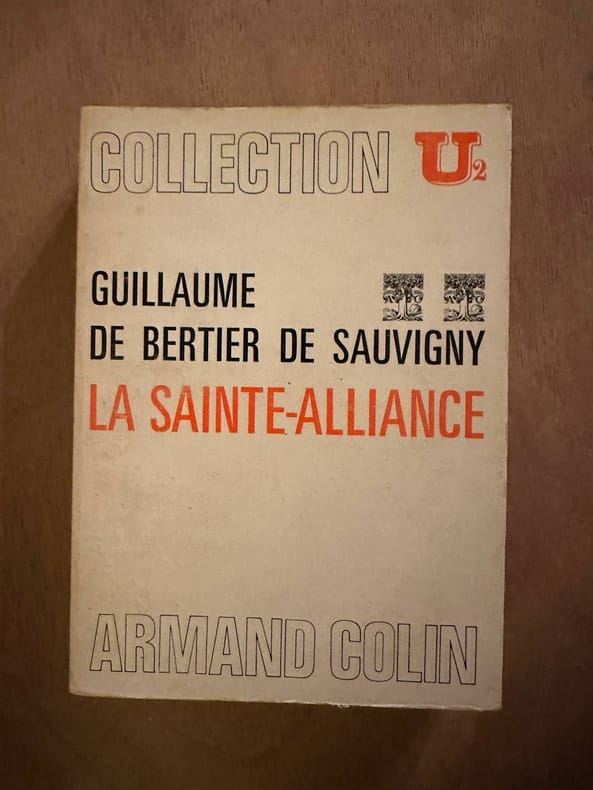 La Sainte-Alliance est formée le 26 septembre 1815 à Paris par trois monarchies européennes victorieuses de l'Empire napoléonien héritier de la France révolutionnaire, dans le but de maintenir la paix dans un premier temps, puis de se protéger mutuellement d'éventuelles révolutions. Constituée dans un premier temps par l'Empire russe, l'empire d'Autriche et le royaume de Prusse, elle fut transformée en Quadruple Alliance puis en Quintuple Alliance. Elle fut rejetée par les États pontificaux et la majorité des pays européens n'y participèrent pas, comme le royaume d'Espagne, le royaume du Portugal, les royaumes scandinaves, la Suisse, le Luxembourg, la Belgique, l'Islande, la Pologne, le royaume des Deux-Siciles. Lord Castlereagh, ministre britannique des Affaires étrangères, l'a qualifiée de « sublime mysticisme et de non-sens ». Ce n'est qu'en 1818, après avoir mis fin à l'occupation étrangère, que la France y prend part. Elle fut dissoute de fait en 1825, à la mort de l'empereur Alexandre Ier, qui en était l'instigateur. — "C'est un exposé clair et complet que procure M. Bourquin. Dès 1804 le tsar Alexandre Ier avait suggéré à Pitt un « système général de droit public en Europe ». Sa formation fut faite d'apports successifs. L'auteur donne leur place aux aspirations fédéralistes. Surtout il combat la légende tenace de l'influence de Mme de Krüdener. Il relève pourtant l'influence de l'illuminisme..." (Paul Leuilliot, Annales ESC, 1957) — "Un exposé clair et complet, dans lequel l'auteur montre comment, pièce par pièce, la construction s'édifia de 1813 à 1818, comment et dans quelles limites une procédure et une philosophie virent le jour. Philosophie moins réactionnaire qu'on ne l'a dit, mais procédure étriquée dès le début, puisque les « Quatre » de Chaumont bornèrent leur garantie d'assistance mutuelle à la seule éventualité d'une agression française ; observons toutefois qu'ils se considéraient en même temps comme les interprètes du « concert européen »." (Jacques Willequet, Revue belge de philologie et d'histoire)