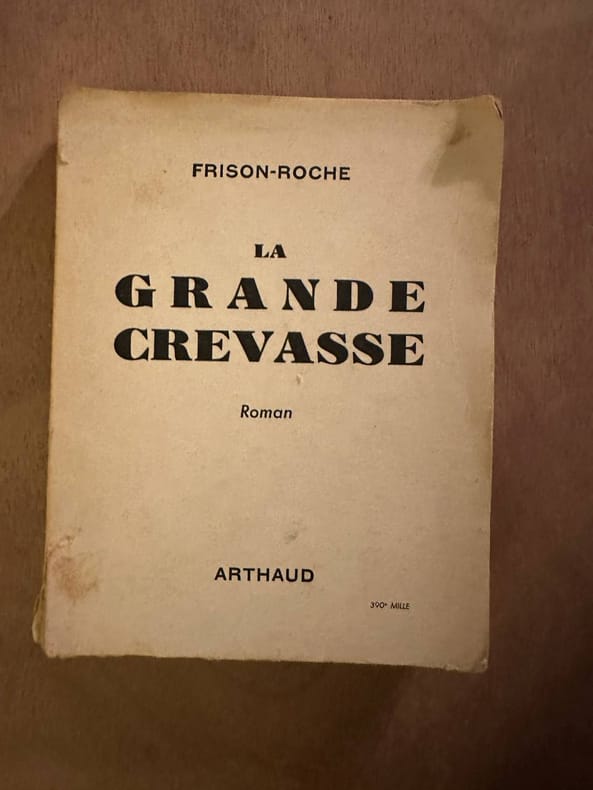 Arthaud 1948 in8. 1948. Broché. La Grande Crevasse est le deuxième tome d'une trilogie de Roger Frison-Roche publié en 1948. Il raconte l'histoire de Brigitte une Parisienne oisive qui lors d'un séjour à Chamonix rencontre Zian un guide de montagne. Cette rencontre la pousse à découvrir l'escalade et les sommets déclenchant en elle une passion profonde pour la montagne mais aussi une relation amoureuse intense qui se transforme en épreuve face à la solitude et aux dangers de la vie de guide