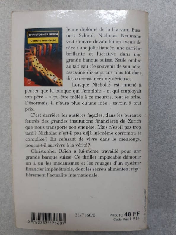 Albin Michel 1998 592 pages in8. 1998. Broché. 592 pages. Brillant courtier en bourse diplômé de Harvard l'ancien Marine Nicholas Neumann est embauché par une grosse banque d'affaires de Zurich que son père représentait aux États-Unis avant d'être assassiné. Affecté au service des comptes numérotés Nick adopte la maxime de papa: "ferme ta bouche et ouvre tes oreilles". Mais il est intrigué par le comportement du Pacha un gros client qui transmet quotidiennement des ordres de virement sur des comptes numérotés dans divers établissements bancaires de la planète. Un jour Nick n'exécute pas les directives du Pacha et sa vie bascule car l'univers bancaire dissimule de précieux secrets qu'il convient de protéger. Abandonné de tous Nick aux prises avec un agent de la CIA et quelques tueurs doit lutter pour sauver sa vie. Avec son premier livre Christopher Reich met à jour un monde clos et mystérieux où se négocient des transactions secrètes et parfois même des meurtres. La vraisemblance du récit le classe parmi les maîtres du thriller financier. --Claude Mesplède