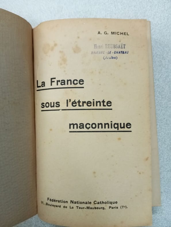 Bruxelles: Fédération Nationale Catholique, s.d. [c. 1932] in-12, 384 pages. Broché, couv. défr., mouillures marginales. Texte anti-maçonnique des années 1930.