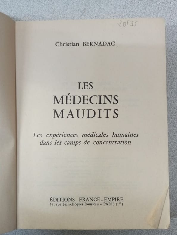 éditions france-empire 1967 288 pages in8. 1967. broché jaquette. 288 pages. Cet ouvrage documente les expérimentations médicales menées sur des détenus dans les camps de concentration nazis pendant la Seconde Guerre mondiale. L'auteur Christian Bernadac rassemble des témoignages et des faits historiques pour révéler ces atrocités commises par des médecins sous le régime nazi