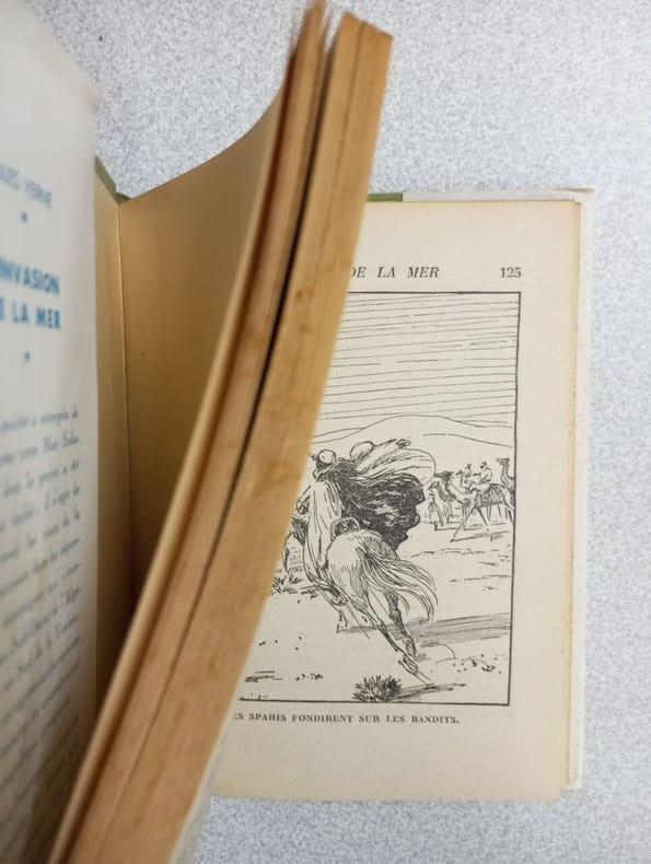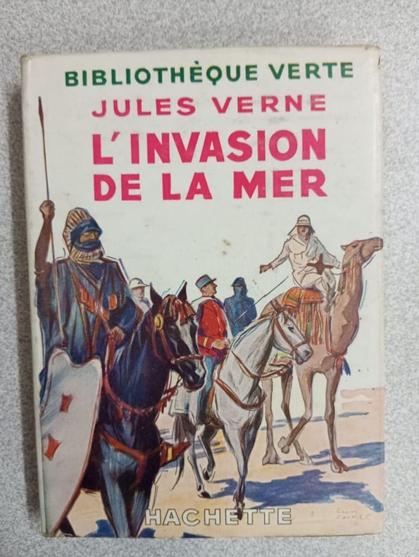 Première et seule édition in-8 illustrée par L. Benett comportant également de nombreuses photographies. Cartonnage éditeur Hetzel "à l'éventail et à l'éléphant" en pleine percaline rouge signé Engel, premier plat polychrome signé Engel, second plat de type "i" comme indiqué par Jauzac, dos au phare, pages de garde bleues d'origines, toutes tranches dorées. Gardes bleues d'origine ombrées marginalement comme habituellement, une pliure et une micro-déchirure sur la première garde, petites taches noire et de décoloration sur le second plat, tampon imprimé de bibliophile en tête de la page de faux-titre. L'Invasion de la Merest un roman d'aventure se déroulant en Tunisie et évoquantun projet authentique, représentatif de l'esprit colonial français. Dans lesannées 1880,François Élie Roudaireprojette de noyer une partie du désert duSaharasous les eaux de la Méditerranée, en creusant un canal depuis legolfe de Gabèsjusqu'auxchotts(via lechott el-Jérid). Le projet finit par être abandonné en raison des difficultés, mais Jules Verne lui donne une suite romanesque. Le Phare du bout du mondevoit quant à lui son action se dérouler en Amérique du Sud. - Photographies et détails sur www.Edition-Originale.com -