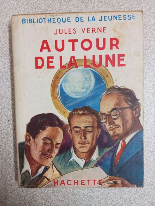 De la terre à la lune, trajet direct en 97 heures et 20 minutes et autour de la lune Collection Hetzel, les Voyages extraordinaires. 41 dessins et une carte par de Montaut, autour de la lune illustré par Emile Bayard et A. de neuville, gravées par Hildibrand. Cartonnage d'éditeur collection Hetzel. vol. in-4, 280x190, bel état intérieur, gravures, tranche de tête dorée, 170, 180pp, très bel état intérieur, tampon du précédent propriétaire. Paris Hachette ss date, 1923