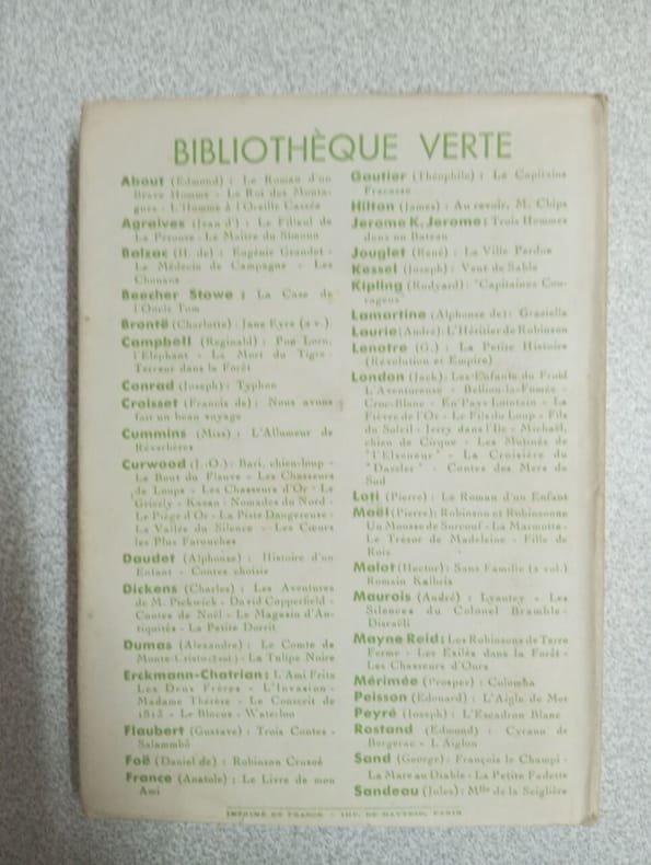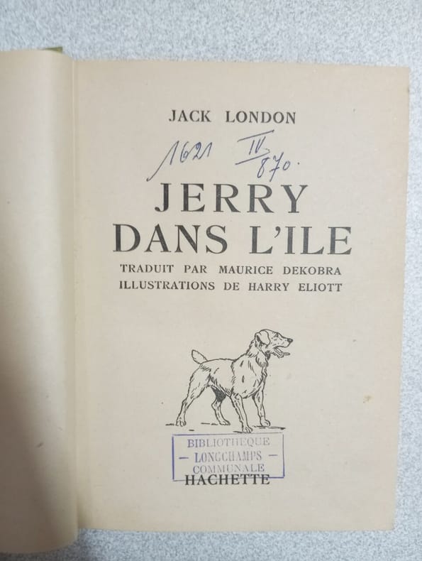 r Bibliothèque verte, in 12 cartonné vert, jaquette illustrée en couleurs. 1) Croc Blanc 256 pages illustrations de GUYOT Hachette 1949. Très bon état. 2) Jerry dans l’Ile 252 pages, Hachette 1948, illustrations de Harry ELIOTT. 3) Contes des mers du Sud cartonné souple, 254 pages, illustrations d’Albert BRENET 4) Michaël chien de cirque 254 pages, 1947. 5) Le fils du loup, l’homme à la balafre, la grande interrogation, le grand silence blanc, au bout de l’arc en ciel, une odyssée au Klondike. Illustrations d’Harry Eliott 188 pages, 1947. 6) la croisière du Snark 255 pages, 1945. Illustrations d’Albert BRENET, 1 carte en frontispice. 7) La croisière du Dazz-ler 192 pages, illustrations d’Albert BRENET (petit manque en pied à la jaquette) l’ensemble