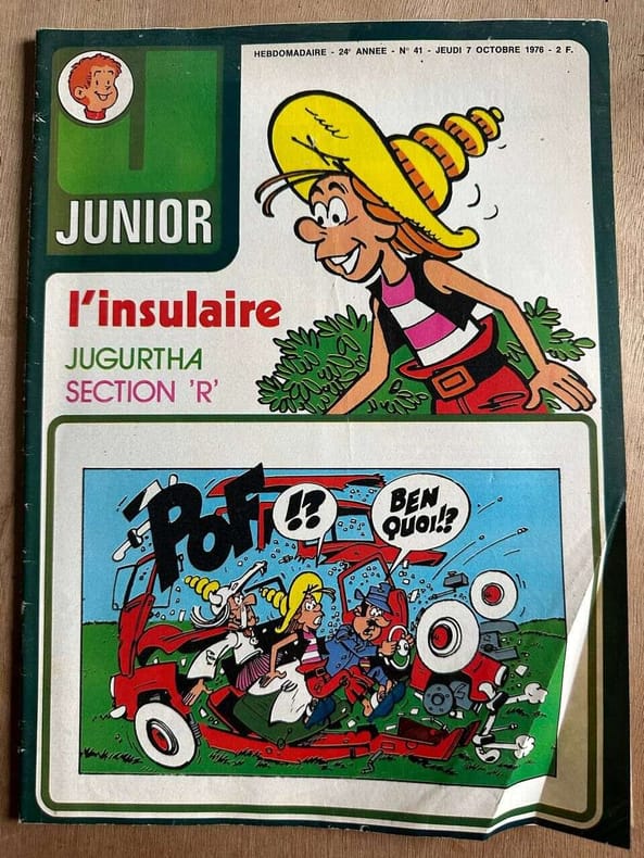 Revue 1974 "In-4 (21 x 28,3 cm), dos agrafés, lot de 41 numéros de la revue ""Junior"" de 1974 (22e année) : du n°1 (3 janvier 74) au n°5 / 7 à 12 / 14 à 24 / 26 / 27 / 36 à 52 (26 décembre 74) ; dos frottés, traces, pliures et frottements aux plats plus ou moins importants selon le numéro, par ailleurs assez bon état général. Livraison a domicile (La Poste) ou en Mondial Relay sur simple demande."