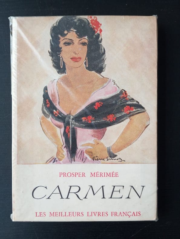 La Bibliothèque Française, 1949. Editeurs Français Réunis. 1954. Un volume in-folio en feuilles sous couverture carton recouverte de papier vélin d 'Arches remplié, titre imprimé sur le front. Emboîtage en carton recouvert de toile de jute, titre imprimé en rouge sur le dos. - 3 AQUATINTES datées sur le cuivre 30.4.49,I,II ou III. (40,7 x 30,5cm). - 1 POINTE-SÈCHE datée sur le cuivre 24.10.60 (20x14,8cm). - 1 LITHOGRAPHIE EN COULEURS « Toreros y Senorita » sur papier report, datée 24.10.60 et 4.11.60 (34,2x23cm). Les 5 épreuves sont numérotées 185/245 et présentées dans un feuillet vélin d'Arches plié en deux inséré dans l'ouvrage. Edition à 275 exemplaires : l'un des 245 exemplaires sur vélin d'Arches, numérotés de 1 à 245, le nôtre porte le N°185, SIGNÉ PAR PICASSO ET ARAGON. Exemplaire en parfait état. (Cramer 126, Bloch 1000 à 1005). Photographies supplémentaires sur demande. - ENGLISH : Pablo PICASSO - Prosper MERIMEE – Louis ARAGON. LE CARMEN DES CARMEN. With three aquatints, one drypoint and one lithograph in color by Pablo Picasso, each numbered 185/245 in pencil. La Bibliothèque Française, 1949. Editeurs Français Réunis. 1954. Portfolio with three aquatints (40,7 x 30,5cm), one dry-point (20x14,8cm), and one lithograph in colors (34,2x23cm), by Pablo Picasso, loose as issued, title, justification page, and text with numerous illustrations in color (printed in lithograph) and border decorations also by Picasso. THE BOOK IS SIGNED BY PICASSO AND ARAGON on the justification page. One of 245 copies on Arches wove paper (n°185), perfectly preserved in the original publisher box (reference : Bloch. 1000-1005 ; Cramer books 126).