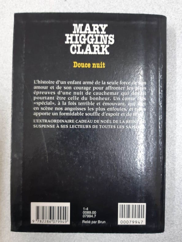 Albin Michel 1995 234 pages in8. 1995. Broché. 234 pages. DOUCE NUIT DE MARY HIGGINS CLARK LE SPECIAL SUSPENSE DE NOËL. L'histoire d'un enfant armé de la seule force de son amour et de son courage pour affronter les pires épreuves d'une nuit de cauchemar qui devait pourtant être celle du bonheur. Un conte très spécial à la fois terrible et émouvant qui met en scène nos angoisses les plus enfouies et nous apporte un formidable souffle d'espoir et de rêve. L'EXTRAORDINAIRE CADEAU DE NOËL DE LA REINE DU SUSPENSE A SES LECTEURS DE TOUTES LES SAISONS