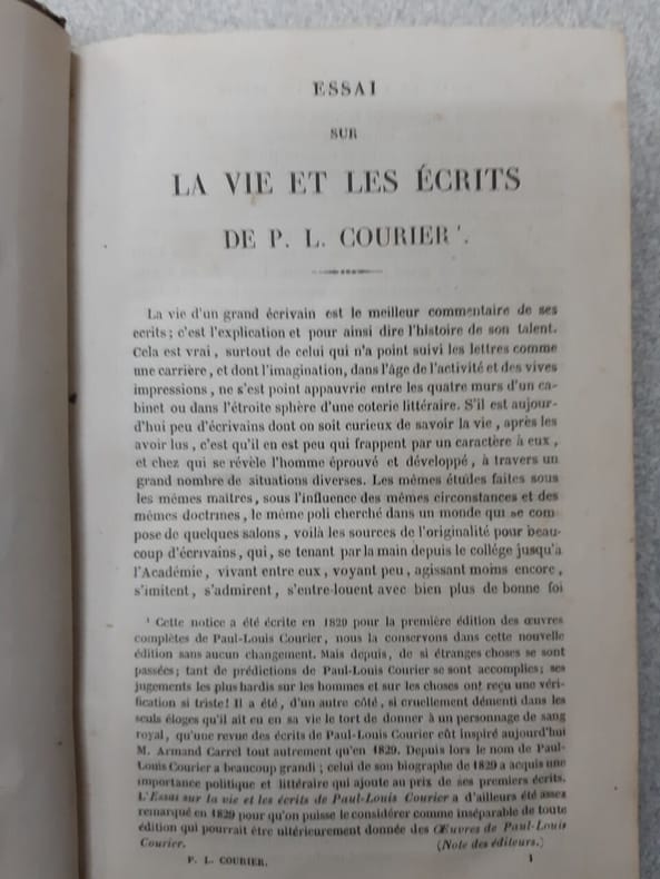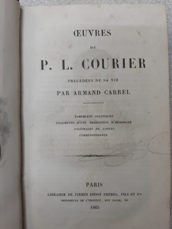 précédée de sa vie par Armand Carrel. Pamphlets politiques -" Fragments d'une traduction d'Hérodote - Pastorales de Longus , correspondance, "Paris, Firmin Didot, 1865. In-12, 606 pages. Demi-chagrin vert , dos à nerfs orné de caissons dorés, Portrait de Paul Louis