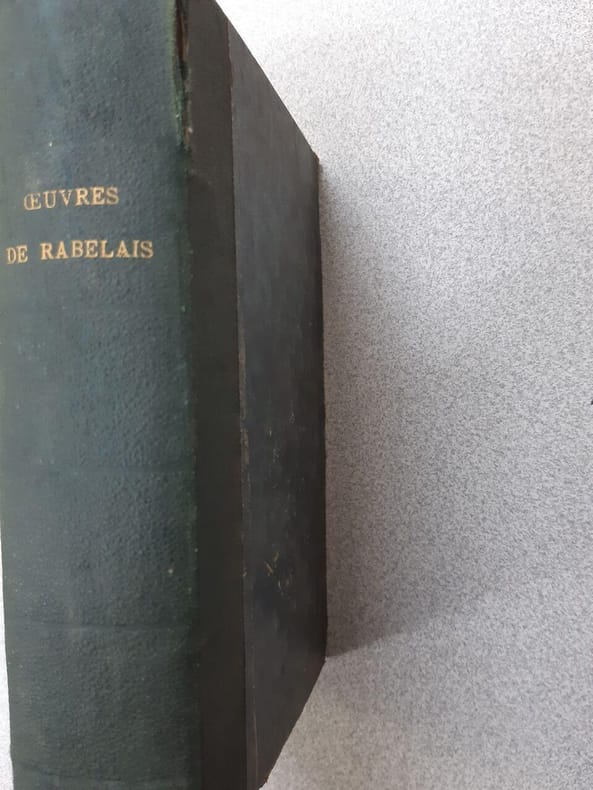 Tome 1 : contient la Vie de Gargantua, Pantagruel restitué en son naturel ; tome 2 : suite de Pantagruel, pièces détachées ; tome 3 : avertissement de l'éditeur, liste des principaux écrivains contemporains de Rabelais, table analytique et raisonnée des matières contenues dans les oeuvres de Rabelais, table des auteurs cités, glossaire, erotica verba, proverbes et jurons. Publié par M. de l'Aulnaie d'après Brunet.......belle Edition.......en bon état malgré le petit défaut signalé (very good condition in spite of the small defect indicated).