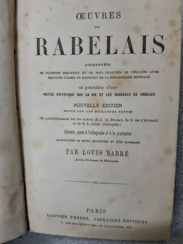 3è tome seul de cette édition des oeuvres de Rabelais (1494?-1553) publiée d'après Brunet par François-Henri-Stanislas de L'AULNAYE (1739-1830): tome (faisant suite à "Gargantua" et "Pantagruel") où l'éditeur présente une intéressante documentation sur l'oeuvre: "Avertissement de l'éditeur" (signé "D.L.") sur l'établissement du texte de cette édition, bibliographie des "Editions partielles ou complètes du roman de Rabelais", les privilèges de François 1er (1545) et de Henri II (1550) pour l'impression de oeuvres de l'écrivain, liste des principaux écrivains et artistes de son époque, index "des principales matières contenues dans les oeuvres de Rabelais", index des auteurs cités, glossaire, glossaire des "erotica verba", liste des "proverbes, façons de parler proverbiales, paronomasies, jeux de mots, calembours contenus dans les oeuvres de Rabelais" (avec "traductions"), liste des "jurons et imprécations".