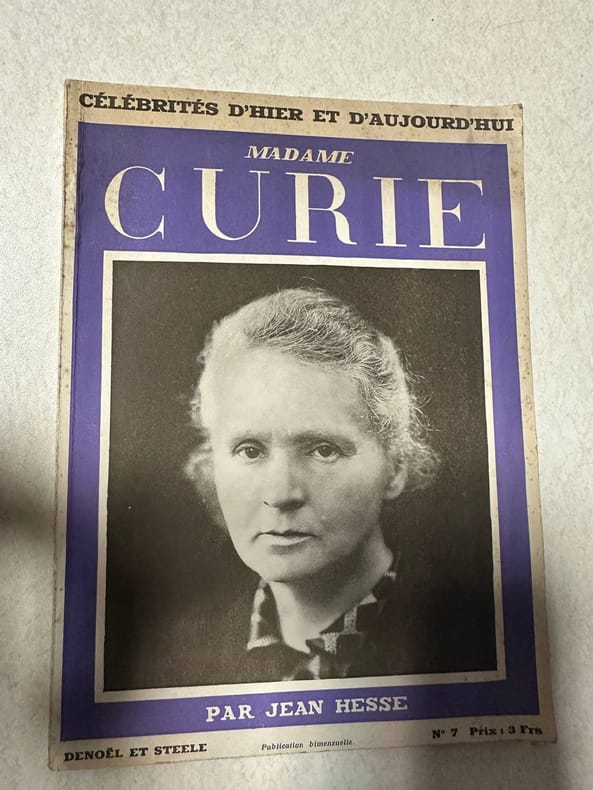 1940 broché in-octavo, dos blanc, non-rogné, illustrations : frontispice-portrait de Madame Curie, 314 pages, 1940 Paris Gallimard,