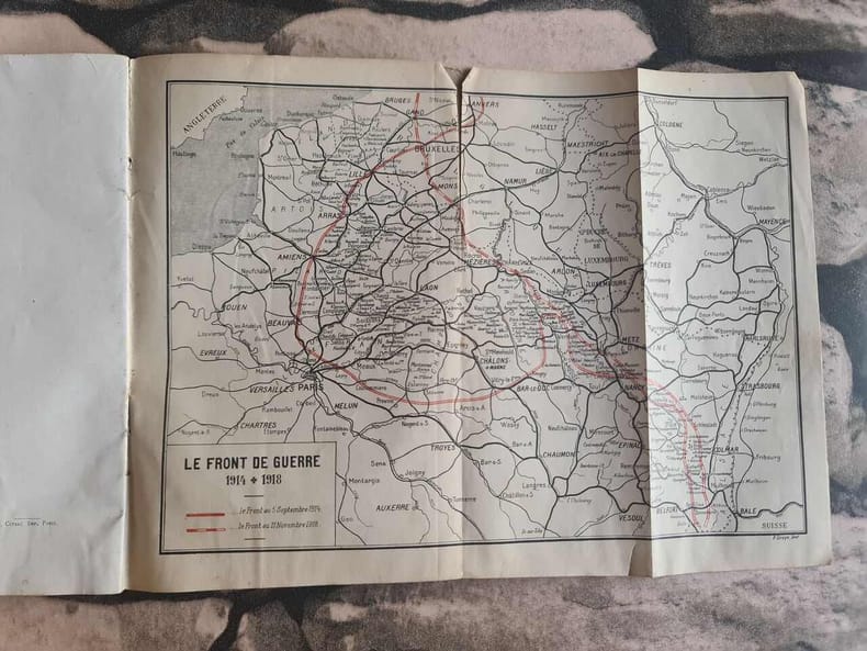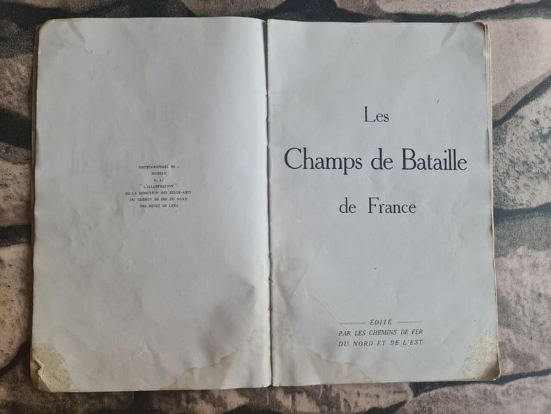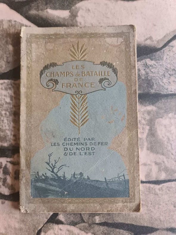 Paris, éd. Les chemins de fer du Nord et de l'Est, S.d. (1919), in-8, cartonnage souple, couv. ill. en coul. avec relief doré éd., 80 pp., papier glacé, 1 carte dépliable en noir, blanc et rouge "le front de guerre. 1914 - 1918", nomenclature des localités principales ou champs de bataille avec désignation des gares les plus voisines, très nb. photos en noir in-texte, Remarquable ouvrage sur l'histoire des champs de bataille durant la Première Guerre mondiale. Superbes photographies en noir en 1918. Bien complet de la carte dépliable de France avec les gares et les lignes de front depuis 1914 à 1918. RARE Très bon état du papier; la couverte est défraîchie avec quelques petits manques au dos