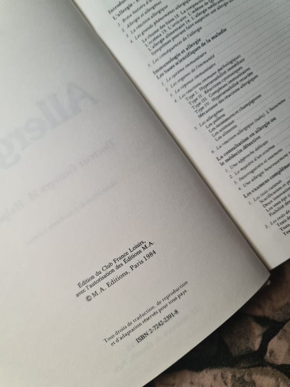 17 figures dans le texte et 10 photographies sur planches hors-texte, certaines en couleurs 1ere édition Contents, Chapitres : Préface, avant-propos, table, xiii, texte, 266 pages - Bases morphologiques et fonctionnelles de l'immunité locale - Allergie alimentaire - Les fausses allergies alimentaires - Allergie et intolérance aux additifs - Diagnostic des allergies alimentaires et fausses allergies alimentaires - Thérapeutique des allergies et fausses allergies alimentaires - Index legeres pliures sur la couverture, sinon bon état, intérieur propre