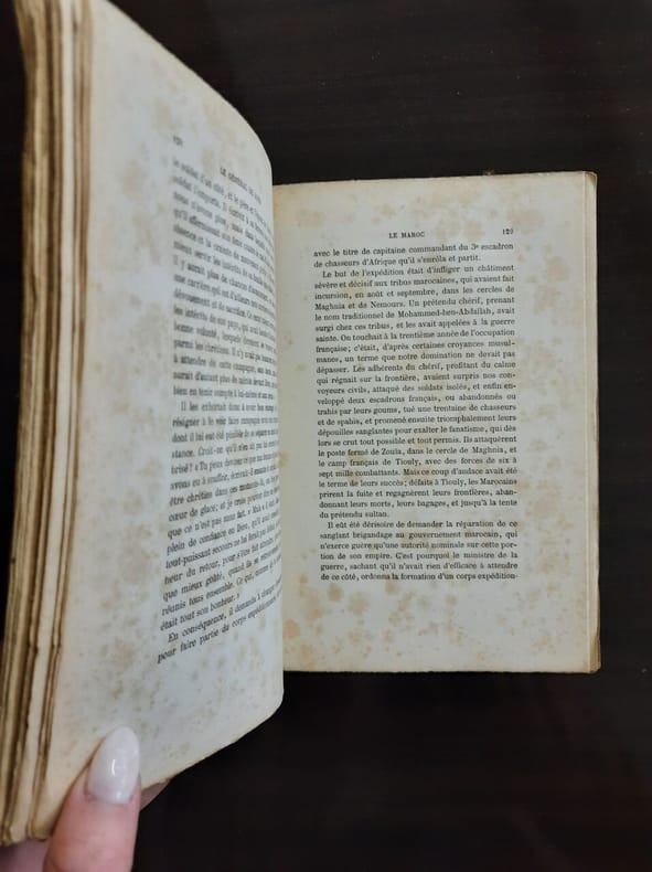 1 planche en frontispice, portrait photographique en pied du général de Sonis, 1825-1882 mention de 37eme édition édition de 1893 "Contents, Chapitres : Préface, xvi, Texte, 616 pages, 16 pages de catalogue Poussièlgue - La Guadeloupe, la France, le collège, 1825-1844 - Saint-Cyr, Castres, Paris, Limoges, 1844-1854 - L'Algérie, la Kabylie, 1854-1859 - La campagne d'Italie, mai-août 1859 - Le Maroc, octobre 1859 - Tenez, Laghouat, Saida, 1860 - Combat de Metlili, une expédition dans le désert, 1865-1866 - Laghouat, la vie chrétienne - Combat d'Ain-Madhi, 1869 - Aumale, 1869-1871 - L'Armée de la Loire, Brou et Loigny, 1879 - L'ambulance et le congé, 1871 - Rennes, 1871-1874 - Saint-Servan, 1874-1880 - Chateauroux, Limoges, 1880-1883 - Paris, l'éternité, 1883-1887 - Appendice - Louis-Gaston de Sonis, comte romain et de Sonis (1er, 1880), né à Pointe-à-Pitre le 25 août 1825 et mort à Paris le 15 août 1887, est un officier de l'armée française qui s'est particulièrement illustré lors de la bataille de Loigny durant la guerre de 1870, où il perdit une jambe. - Louis-Gaston de Sonis est né à la Guadeloupe où son père, Jean-Baptiste de Sonis (1795-1844), était officier. Il s'installe en métropole au Prytanée militaire pour y faire ses études4. Il intègre le collège de Juilly puis l'École spéciale militaire de Saint-Cyr, à la sortie de laquelle il rejoint l'École d'application de Cavalerie à Saumur. Il en sort sous-lieutenant et rejoint le 5e régiment de hussards basé à Castres. Sollicité par ses camarades de s'affilier à la franc-maçonnerie, ignorant les condamnations de l'Église qui la frappent, il est initié par la loge maçonnique du Grand Orient de France et s'affilie dès son arrivée en 1848 à la très républicaine loge lHarmonie universelle à Castres. Remplaçant régulièrement le 1er surveillant, il est élu 2e maître des cérémonies le 16e jour du 10e mois de 5848 (16 décembre 1848). Il claque avec fracas la porte de cette organisation quelques mois plus tard : « [] c'est un piège ! [] Vous n'avez pas tenu vos promesses ; je suis délié des miennes. Vous ne me reverrez plus. Bonsoir ! » De son passage de neuf mois dans la franc-maçonnerie, il conserve un mauvais souvenir et déconseillera plus tard à ses fils d'y adhérer : « Le père de famille veillera avec soin à ce qu'aucun des siens ne fasse partie d'une société secrète » (Mémoire). - Après Paris, puis Limoges, il est nommé capitaine en 1854 et quitte Limoges pour l'Algérie. Il s'établit à Alger et participe à l'expédition de la Kabylie lors de la campagne de 1857. Après l'attaque d'El-Amiz et la soumission des Beni-Raten, il conduit une messe d'action de grâces. Louis-Gaston de Sonis est ensuite désigné pour la campagne d'Italie de mai à août 1859. Il commande la charge de son escadron lors de la bataille de Solférino. En octobre 1859, il se porte volontaire pour la campagne du Maroc, durant laquelle son principal ennemi sera le choléra. En 1860, Sonis est nommé commandant supérieur du cercle de Tenez, puis de Laghouat et enfin de Saïda. En 1865 il participe au combat de Metlili et conduit une expédition dans le désert en 1866. En 1869, il dirige le combat d'Ain-Madhi. Cet officier très pieux est connu aussi pour avoir combattu en 1870 à la tête des Zouaves pontificaux et des Volontaires de l'Ouest sous l'étendard du Sacré-Cur de Jésus et la devise Miles Christi (soldat du Christ), aux côtés du futur général de Charette. Grièvement blessé lors du combat, il passa la nuit, par -20°, sur le champ de bataille de Loigny à rassurer les soldats blessés eux aussi autour de lui. On lui amputa la jambe gauche le 4 décembre 18707. Il est anobli par le pape Léon XIII et titré « comte romain et de Sonis » en 1880. La même année, à Châteauroux, il se fait mettre en disponibilité pour protester contre l'expulsion des religieux de France. En 1883, du fait de ses infirmités, il doit quitter le commandement actif et devient membre d'une commission au ministère de la Guerre à Paris, où il meurt en 1887. Son corps est inhumé à Loigny, dans la crypte de l'église, près des zouaves pontificaux et soldats tombés à la bataille du 2 décembre 1870. Sur la pierre tombale est gravée l'inscription « Miles Christi » (Soldat du Christ). (source : Wikipedia)" couverture en bon état, avec une légère trace de pliure au coin supérieur droit du plat supérieur, un infime petit manque au coin inférieur, intérieur sinon frais et propre, papier à peine jauni, cela reste un bon exemplaire, presque très bon, bien complet de la planche en frontispice