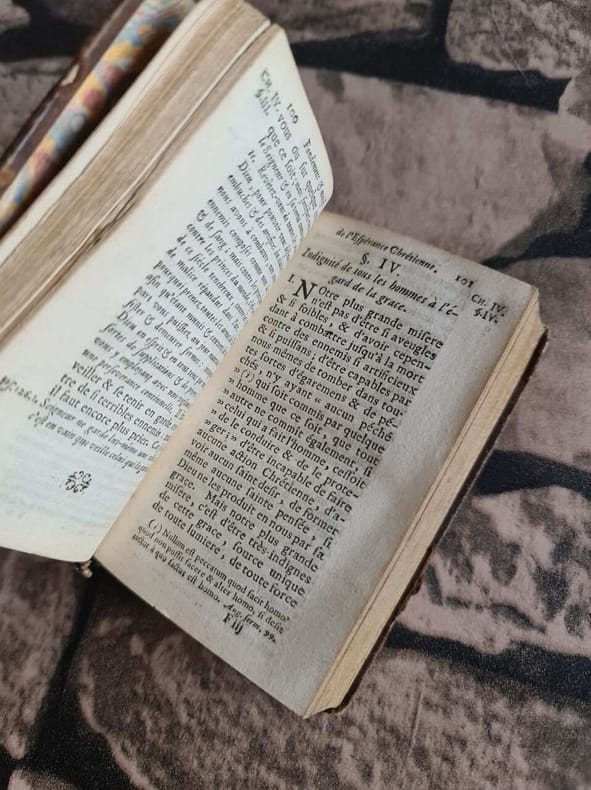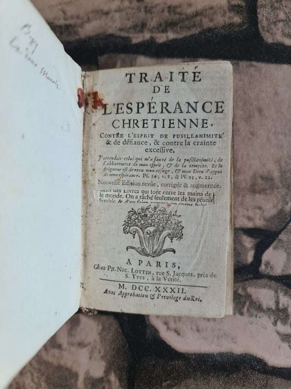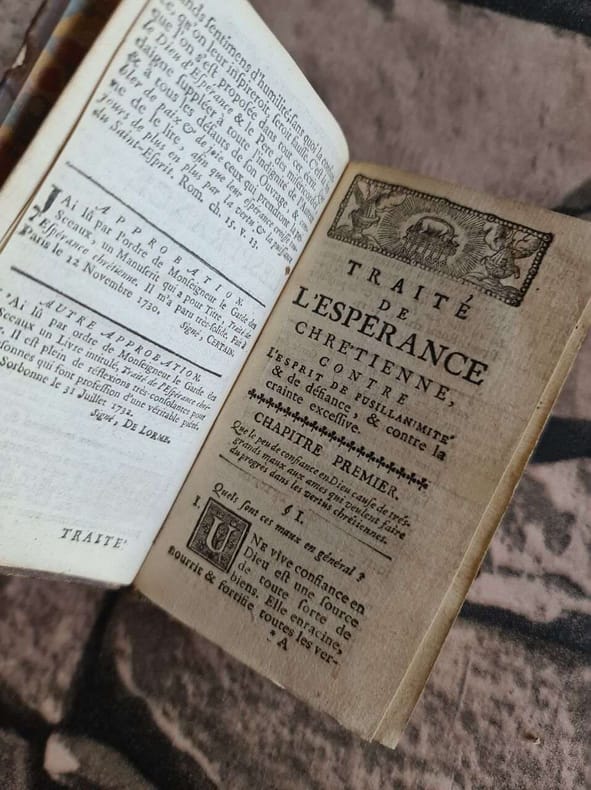 Avignon, Aux dépens de la Compagnie 1753-1755 Complet en 2 tomes: [iv] 449 [xv] + [2bl] [xii] 372 [2bl] pp., reliures plein-cuir (titre et décorations dorés aux dos), 17cm., bel état, [Contenu: tome I: Où l'on explique le fondement & les caractères de l'Espéracne chrétienne, & de la vraie confiance en Dieu par Jésus-Christ, Tome II: Où l'on montre comment tout fidèle peut & doit s'affermir de plus en plus, dans une espérance & confiance en Dieu par Jesus-Christ, qui ait les caractères qu'on a expliqués]