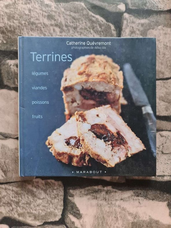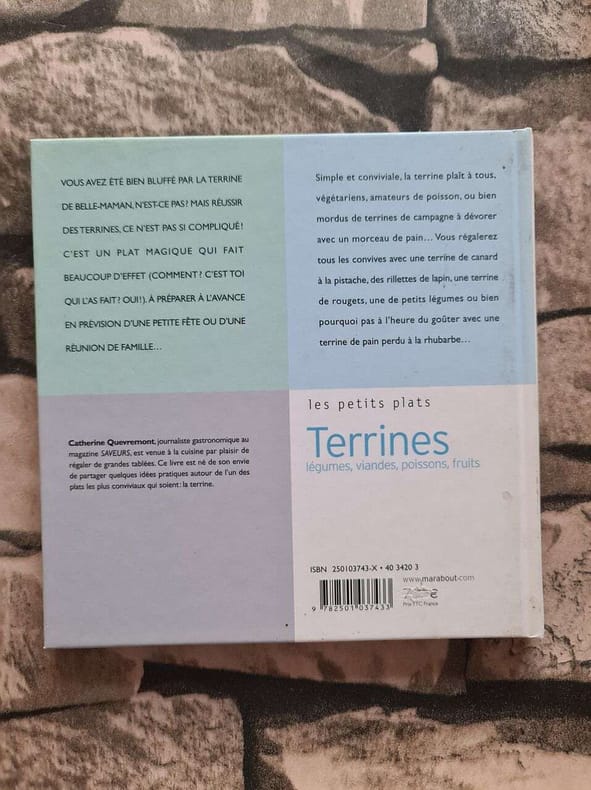 Paris, Marabout éd., novembre 2002, in-8 carré, cartonnage rigide, Couv. photo coul. éd., 64 pp., nb. photos coul. d'Akiko Ida. Sommaire. Vous avez été bien bluffé par la terrine de belle-maman, n'est-ce pas ? Mais réussir des terrines, ce n'est pas si compliqué ! C'est un plat magique qui fait beaucoup d'effet (Comment ? C'est toi qui l'as fait ? Oui !). A préparer à l'avance en prévision d'une petite fête ou d'une réunion de famille... Simple et conviviale, la terrine plaît à tous, végétariens, amateurs de poisson, ou bien mordus de terrines de campagne à dévorer avec un morceau de pain... Vous régalerez tous les convives avec une terrine de canard à la pistache, des rillettes de lapin, une terrine de rougets, une de petits légumes ou bien pourquoi pas à l'heure du goûter avec une terrine de pain perdu à la rhubarbe… TBE