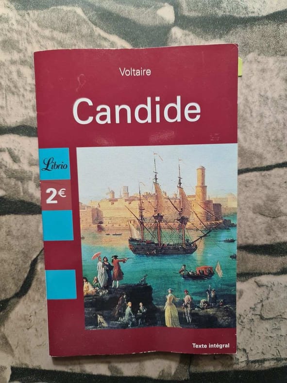 préface de Francisque Sarcey, illustrations de Adrien Moreau Candide est un conte philosophique. Il a pour personnage principal un jeune homme, Candide, qui vit dans un château avec sa cousine, Cunégonde, et son oncle. Il y est éduqué par un précepteur philosophe, Pangloss, qui suit la théorie de Leibniz, philosophe du XVIIe siècle, selon laquelle, notamment, « tout est pour le mieux dans le meilleur des mondes possibles ». Candide adhère d’abord à cette idée ; mais lorsque son oncle le chasse du château après l’avoir surpris en train d’embrasser Cunégonde, la vie va lui faire revoir cette opinion. Candide va en effet traverser une série de péripéties qui seront autant d’épreuves. Il se bat contre les Abares et découvre les horreurs de la guerre ; il assiste à la mort de milliers d’hommes et de femmes lors du tremblement de terre de Lisbonne ; il est condamné à mort injustement et en réchappe comme par miracle ; il découvre la manière cruelle dont sont traités les esclaves noirs, et finit par se réfugier en Turquie. Sur son chemin, il perd et retrouve tour à tour Pangloss et Cunégonde. A la fin du conte, ils vivent tous ensemble en Turquie et se contentent de « cultiver leur jardin », c’est-à-dire de s’occuper de leurs affaires privées sans plus se mêler du monde. « Il faut cultiver son jardin » est en effet le mot final du derviche, un mystique et sage de confession musulmane. Les principaux thèmes de cette œuvre sont ainsi le bonheur, la justice, l’ordre du monde et la politique. volume in-4, 255x170, jolie reliure, dos à nerfs, tranches de tête dorée, bel état intérieur, 174pp, couvertures d'origines conservées, coins lg. frottés, état intérieur neuf. Paris Jules Tallandier ( collection, " Les chefs d’œuvres de l'esprit " ), sans date, vers 1900 ref/241