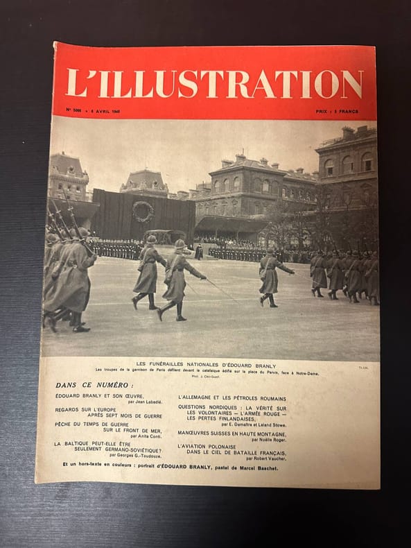 L'illustration 1940 env 50p pages in8. 1940. Agrafé. env 50p pages. journal hebdomadaire universel magazine avec publicité d'époque articles agrémentés de photographies noir et blanc une reproduction couleur d'un pastel d'Edouard. Branly