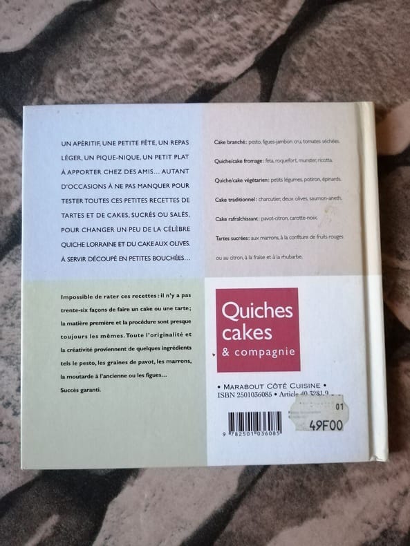 Coll. "Côté cuisine", Paris, éd. Marabout, janvier 2003, pt. in-8 carré, cartonnage rigide éd., couv. photo coul. éd., 65 pp., nb. photos coul. d'Akiko Ida, sommaire, glossaire. Un apéritif, une petite fête, un repas léger, un pique-nique, un petit plat à apporter chez des amis… Autant d'occasions à ne pas manquer pour tester toutes ces petites recettes de tartes et de cakes, sucrés ou salés, pour changer un peu… Très bon état