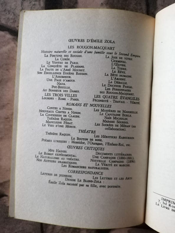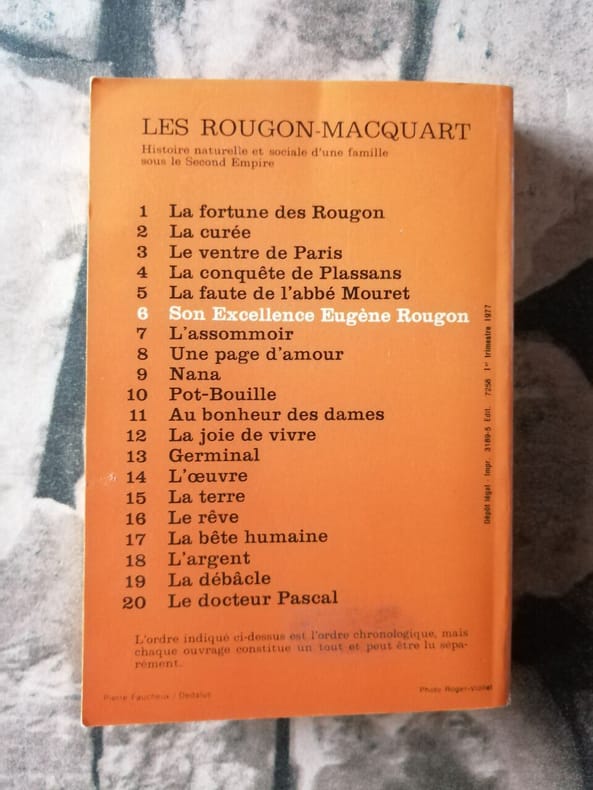 Volume 1 : La Fortune des Rougon + La Curée - Volume 2 : Le ventre de Paris tome premier + La conquête de Plassans - Volume 3 : La faute de l'Abbé Mouret + Son excellence Eugène Rougon - Volume 4 : L'Assommoir + Une page d'amour - Volume 5 : Nana tome premier + Pot-Bouille tome premier. Classification Dewey : 840.091-XX ème siècle