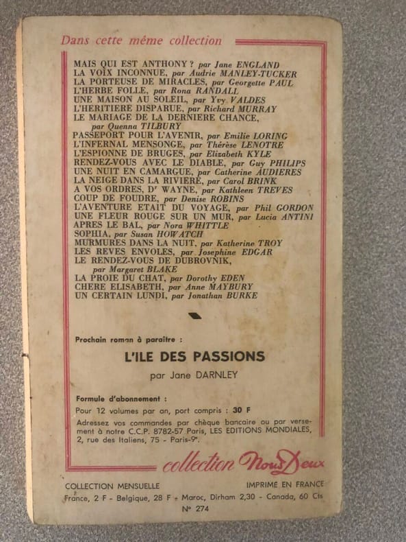 LES EDITIONS MONDIALES / COLLECTION NOUS DEUX N°274. 1969. In-12. Broché. Etat d'usage, Couv. légèrement passée, Dos fané, Quelques rousseurs. Environ 220 pages. Tâche en page de garde.. . . . Classification Dewey : 820-Littératures anglaise et anglo-saxonne