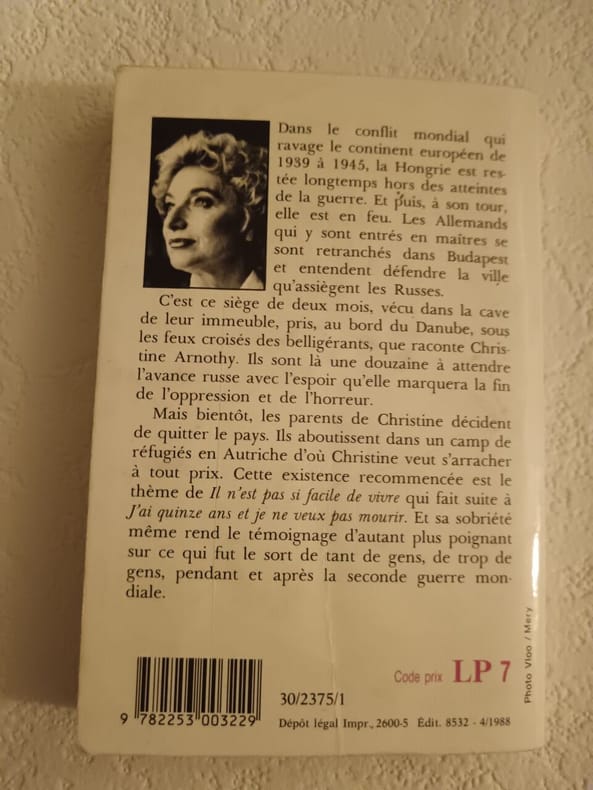 France Loisirs 1982 330 pages in8. 1982. cartonné sous jaquette. 330 pages. dans le conflit mondial qui ravage le continent européen de 1939 à 1945 la hongrie est restée longtemps hors des atteintes de la guerre. et puis à son tour elle est en feu. les allemands qui y sont entrés en maîtres se sont retranchés dans budapest et entendent défendre la ville qu'assiègent les russes. c'est ce siège de deux mois vécu dans la cave de leur immeuble pris au bord du danube sous les feux croisés des belligérants que raconte christine arnothy. ils sont là une douzaine à attendre l'avance russe avec l'espoir qu'elle marquera la fin de l'oppression et de l'horreur. mais bientôt les parents de christine décident de quitter le pays. ils aboutissent dans un camp de réfugiés en autriche d'où christine veut s'arracher à tout prix. cette existence recommencée est le thème de il n'est pas si facile de vivre qui fait suite à j'ai quinze ans et je ne veux pas mourir. et sa sobriété même rend le témoignage d'autant plus poignant sur ce qui fut le sort de tant de gens de trop de gens pendant et après la seconde guerre mondiale