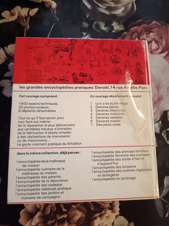 Encyclopédie du bricolage et des loisirs manuels - tome 1 : l'atelier - l'outillage électrique - le travail du bois - tome 2 : la charpente - la couverture - l'isolation - la maçonnerie - tome 3 : le travail du métal - l'eau dans la maison - la vitrerie - la peinture et le vernis - tome 4 : les revêtements - l'électricité - tome 5 : le bricolage ménager - l'audio-visuel - tome 6 : initiation aux métiers d'art - jardin et garage - le droit et la maison - les soins d'urgence - index général Editions Chantereine 1976 6 volumes reliés format : 26 x 19.5 cm nombreuses illustrations et schémas