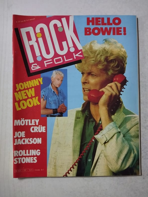 124 PAGES FORMAT 21 CM X 27 CM-DAVID BOWIE ET JOHNNY HALLYDAY EN COUVERTURE-MOTLEY CRUE, 4P, 2 PHOTOS-JOE JACKSON, 2P, PHOTO-QUEEN, 2P, 2 PHOTOS-DAVID BOWIE, 2P, 1 PHOTO-ROLLING STONES, 6P, 9 PHOTOS-COMME UN CAMION, JOHNNY HALLYDAY, 6P, 3 PHOTOS
