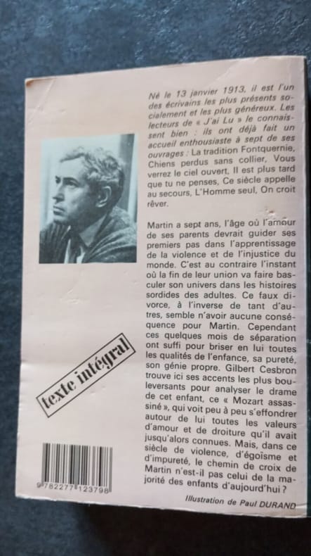 J'ai lu 1974 307 pages 11 0cm x 16 5cm x 1 5cm. 1974. broché. 307 pages. Martin a sept ans l'âge où l'amour de ses parents devrait guider ses premiers pas dans l'apprentissage de la violence et de l'injustice du monde. C'est au contraire l'instant où la fin de leur union va faire basculer son univers dans les histoires sordides des adultes va briser en lui toutes les qualités de l'enfance sa pureté son génie propre. Gilbert Cesbron trouve ici ses accents les plus bouleversants pour analyser le drame de cet enfant ce Mozart assassiné qui voit peu à peu s'effondrer autour de lui toutes les valeurs d'amour et de droiture qu'il avait jusqu'alors connues. Mais dans ce siècle de violence d'égoïsme et d'impureté le chemin de croix de Martin n'est-il pas celui de la majorité des enfants d'aujourd'hui