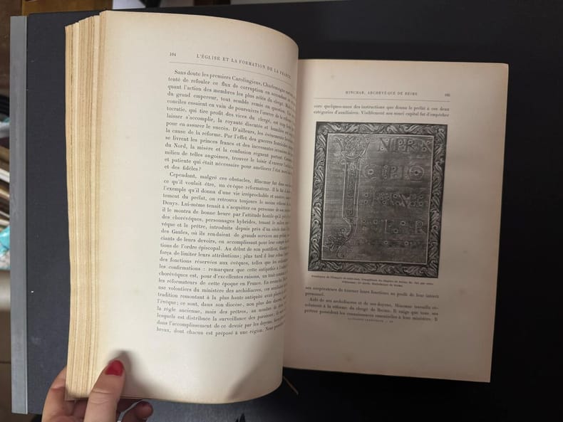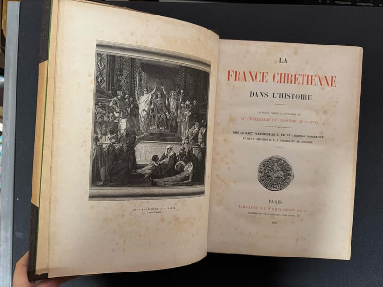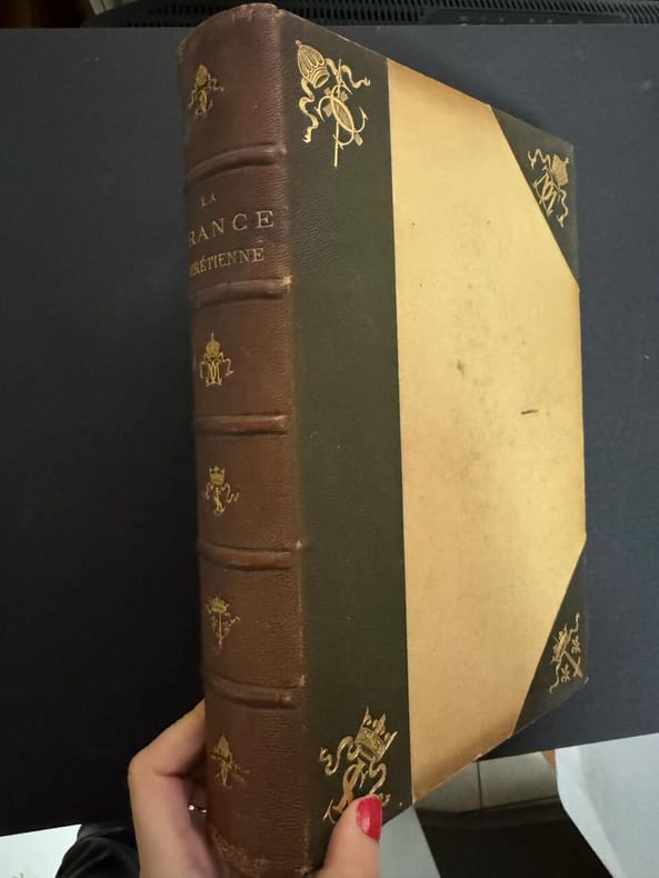 LA FRANCE CHRÉTIENNE DANS L'HISTOIRE ouvrage publié à l'occasion du 14e centenaire du baptême de Clovis. édition illustrée, reliure orné de fleurons dorés et monogrammes. vol.in-4, 290x210, relié demi cuir, dos à nerfs, toutes tranches dorées, très bel état intérieur, 683pp Paris, Firmin Didot, 1896