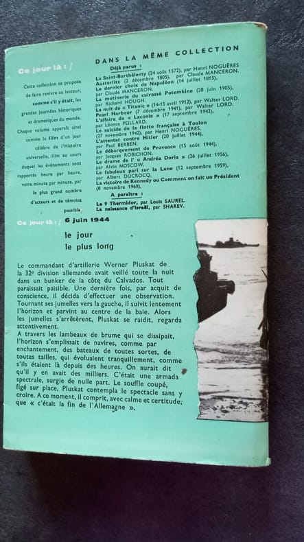 Ce jour-là: 6 juin 1944. L'histoire vue des deux cotés du débarquement en Normandie. La plus formidable opération de tous les temps pour l'audace de l'assaut mais également pour le déploiement logistique absolument exceptionnel. Un livre, paru initialement en 1963, qui allait créer une nouvelle forme d'aborder l'histoire - Le récit historique minutieux mais aussi très vivant - qui allait faire école. Ce livre a également été le support du scénario du film ˮLe jour le plus longˮ.