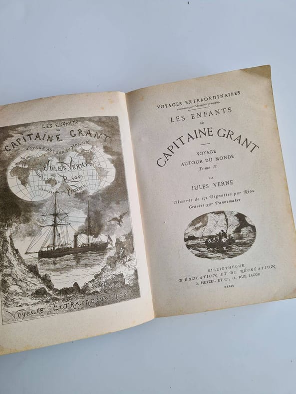 Nouvelle édition illustrée de 172 dessins par Riou, gravés par Pannemaker. Cartonnage d'éditeur dit "A la mappemonde" ou "Au dos à l'ancre", biseauté. Second plat de type Engel i. Très belle plaque supérieure aux ors particulièrement rutilants, signée Engel dans l'ancre. Traces sombres à gauche et à droite de la mappemonde. Beau dos avec les coiffes molles mais non affaissées, infimement passé ; ce dos porte la particularité de posséder une partie basse contrecollée, comme pour les premiers cartonnages à l'empiècement, on peut penser qu'il s'agit d'un des premiers dos à l'ancre, formé comme pour les premiers cartonnages au globe doré, d'un empiècement en partie basse ; cependant, ce cartonnage à la mappemonde n'en est pas à son coup d'essai, il a été dans cette version amincie (les premiers trop volumineux et lourds se déformaient) et le dos est plus harmonieux, perdant sa large bande rouge disgracieuse. Rappelons que ce cartonnage a bénéficié d'une courte vie et habillé seulement trois titre : Les enfants du capitaine Grant, L'île mystérieuse et Matthias Sandorf. Second plat parfait. Coins bien pointus, légèrement frottés. Un accroc sur la bordure intérieure du second plat sur 8mn. Tranches parfaites. Percaline luisante. Exemplaire très frais, totalement exempt de rousseurs. Magnifique exemplaire, très rare dans cette condition. Un des grands classiques de l'auteur, 2 enfants partent à la recherche de leur père naufragé. Le roman conduit le lecteur de l'Écosse à la Nouvelle-Zélande en passant par des îles Canaries, le Cap-Vert, le détroit de Magellan, la cordillère des Andes, la pampa argentine, le cap de Bonne-Espérance, l'île Amsterdam, et l'Australie. Rappelons que Les enfants du capitaine Grant forment une trilogie avec L'île mystérieuse puis 20000 lieues sous les mers, non une suite, mais bien une trilogie. - Photographies et détails sur www.Edition-Originale.com -
