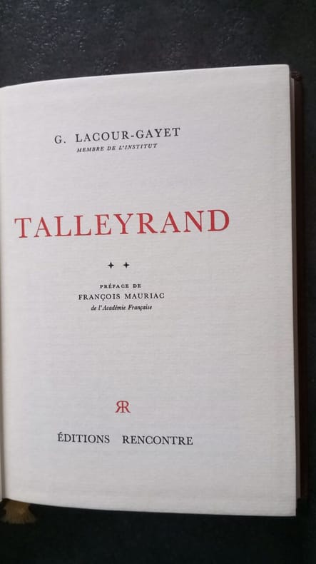 Paris, Librairie Plon, E. Plon, Nourrit et Cie, imprimeurs-éditeurs, rue Garancière, 10 Relié "Trois volumes in-8 (17 x 25 cm), reliure demi-chagrin à coins, dos à 5 nerfs, cet ensemble de trois volumes de la série ""Correspondance diplomatique de Talleyrand"" (avec introduction et notes par G. Pallain) comprend : ""La Mission de Talleyrand à Londres, en 1792"" (1889, 479 pp.), ""Ambassade de Talleyrand à Londres, 1830-1834 (Première partie)"" (1891, 443 pp.), et ""Le Ministère de Talleyrand sous le Directoire"" (1891, 465 pp.), envoi de Pallain dans chaque volume ; dos un peu insolés, des épidermures et frottements sur le cuir, par ailleurs assez bon état général. Livraison a domicile (La Poste) ou en Mondial Relay sur simple demande."