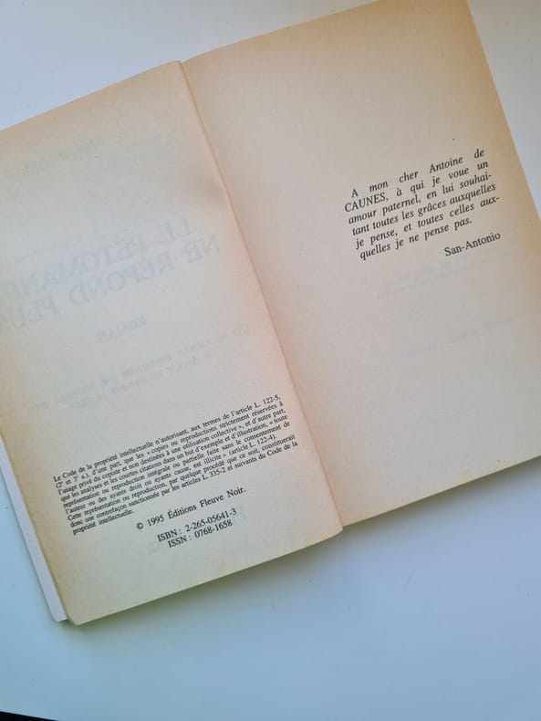 "Editions Fleuve noir. Collection San-Antonio. ""Qui ne saurait constituer une nouvelle suite à Autant en emporte le vent"". Classification Dewey : 843.0875-Sanantonio"