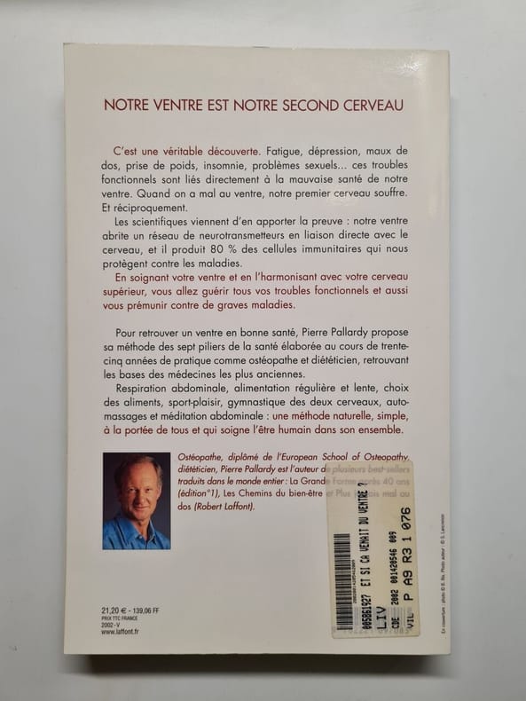 Robert Laffont 2002 260 pages 15 5cm x 24cm x 2cm. 2002. Broché. 260 pages. C'est une véritable découverte. Fatigue dépression maux de dos prise de poids insomnie problèmes sexuels... ces troubles fonctionnels sont liés directement à la mauvaise santé de notre ventre. Quand on a mal au ventre notre premier cerveau souffre. Et réciproquement. Les scientifiques viennent d'en apporter la preuve : notre ventre abrite un réseau de neurotransmetteurs en liaison directe avec le cerveau et il produit 80 % des cellules immunitaires qui nous protègent contre les maladies. En soignant votre ventre et en l'harmonisant avec votre cerveau supérieur vous allez guérir tous vos troubles fonctionnels et aussi vous prémunir contre de graves maladies. Pour retrouver un ventre en bonne santé Pierre Pallardy propose sa méthode des sept piliers de la santé élaborée au cours de trente-cinq années de pratique comme ostéopathe et diététicien retrouvant les bases des médecines les plus anciennes. Respiration abdominale alimentation régulière et lente choix des aliments sport-plaisir gymnastique des deux cerveaux auto-massages et méditation abdominale : une méthode naturelle simple à la portée de tous et qui soigne l'être humain dans son ensemble