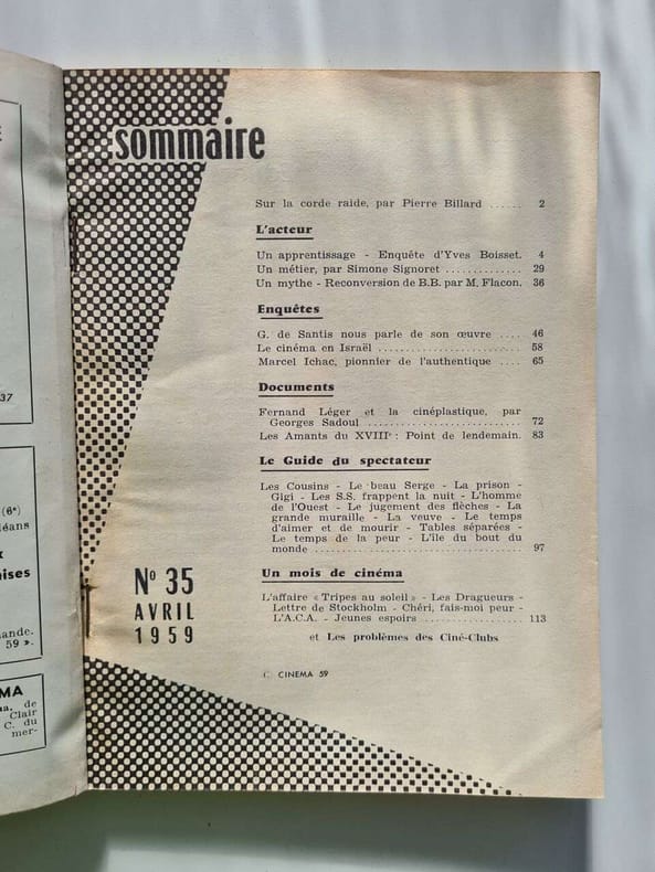 18 CM X 13,5 CM-EN COUVERTURE; FERNANDEL-L'ACTEUR UN APPRENTISSAGE, ENQUETE D'YVES BOISSET-TEMOIGNAGES DE 4 JEUNES QUI ONT REUSSI; MYLENE DEMONGEOT, GERARD BLAIN, PASCALE PETIT, JACQUES CHARRIER-L'ACTEUR UN METIER, PAR SIMONE SIGNORET, ENTRETIEN, 7P-L'ACTEUR UN MYTHE; RECONVERSION DE BRIGITTE BARDOT, PAR MICHEL FLACON, 9P-ENTRETIEN AVEC GIUSEPPE DE SANTIS, 12P-ISRAEL, UN CINEMA SANS PASSE NI AVENIR ? 7P-MARCEL ICHAC, PIONNIER DE L'AUTHENTIQUE, 6P-FERNAND LEGER ET LA CINEPLASTIQUE, 11P-LES AMANTS DU XVIII E: POINT DE LENDEMAIN, 14P-LES FILMS DU MOIS; LES COUSINS, LE BEAU SERGE, GIGI, TABLES SEPAREES, LES SS FRAPPENT LA NUIT, L'HOMME DE L'OUEST, L'ILE DU BOUT DU MONDE, LE JUGEMENT DES FLECHES, LA GRANDE MURAILLE, LE TEMPS D'AIMER ET DE MOURIR, LA PRISON, LE TEMPS DE LA PEUR-JEUNES ESPOIRS: JEAN PAUL BELMONDO, ALAIN DELON, JEAN CLAUDE BRIALY, PASCALE AUDRET, LAURENT TERZIEFF, JULIETTE MAYNIEL, BETTY SCHNEIDER, ANDREA PARISY, BERNADETTE LAFFONT (10F)
