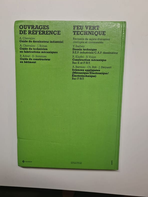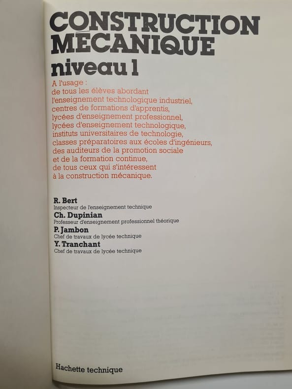 Hachette Technique 1979 in8. 1979. Cartonné. Il s'agit d'un manuel technique de construction mécanique de niveau 1 publié par Hachette Technique co-écrit par R. Bert Ch. Dupinian P. Jambon et Y. Tranchant. L'ouvrage datant de 1979 fait partie d'une collection de guides destinés aux techniciens et vise à fournir une culture technique et des compétences adaptables aux évolutions technologiques