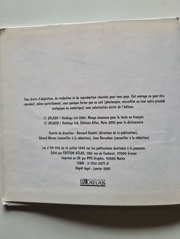 ATLAS / SPLASH. 2001. In-12. Relié. Etat d'usage, Couv. convenable, Dos satisfaisant, Quelques rousseurs. environ 22 + 22 pages illustrées en couleur - exemplaires de bibliotheque avec divers tampons/ etiquettes/ annotations, sans conséquence sur la lecture + recouverts de films plastique avec adhésif sur les contreplats. . . . Classification Dewey : 843.0692-Livres d'enfants