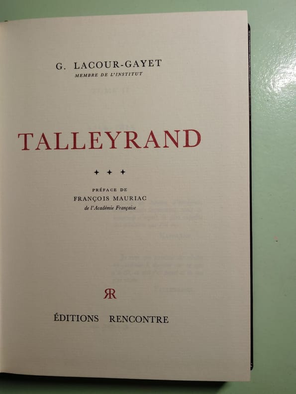 Paris, Librairie Plon, E. Plon, Nourrit et Cie, imprimeurs-éditeurs, rue Garancière, 10 Relié "Trois volumes in-8 (17 x 25 cm), reliure demi-chagrin à coins, dos à 5 nerfs, cet ensemble de trois volumes de la série ""Correspondance diplomatique de Talleyrand"" (avec introduction et notes par G. Pallain) comprend : ""La Mission de Talleyrand à Londres, en 1792"" (1889, 479 pp.), ""Ambassade de Talleyrand à Londres, 1830-1834 (Première partie)"" (1891, 443 pp.), et ""Le Ministère de Talleyrand sous le Directoire"" (1891, 465 pp.), envoi de Pallain dans chaque volume ; dos un peu insolés, des épidermures et frottements sur le cuir, par ailleurs assez bon état général. Livraison a domicile (La Poste) ou en Mondial Relay sur simple demande."