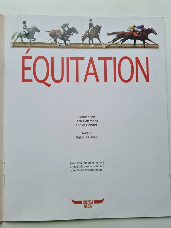 139 illustrations en noir et blanc, figures et photographies 1ere traduction en français, 1995 Contents, Chapitres : Préface, remerciements, introduction - Le style western - Le déplacement - La conformation - Les races de chevaux western - La tenue et le harnachement western - Le travail de base - Le travail du jeune cheval - La consolidation des bases - L'équitation western de haut niveau - Les épreuves de compétition western - Annexes, glossaire, adresses utiles - L'équitation western est une équitation qui s'est développée dans l'Ouest des États-Unis au XIXe siècle (à partir de la Conquête de l'Ouest). Historiquement, elle était avant tout une équitation de travail pratiquée sur les ranchs par les cow-boys. Elle est aussi désormais une équitation de loisir et de compétition. Elle a pour origine principale l'équitation espagnole, à laquelle s'ajoute l'influence anglo-saxonne. Elle est aussi appelée « équitation américaine », mais cette dénomination est contestée. Surtout pratiquée aux États-Unis, l'équitation western l'est aussi en Europe, par des cavaliers cherchant une approche du cheval différente de celle de l'équitation dite classique ou « à l'anglaise ». La monte américaine permet un contrôle absolu du cheval, à condition que le cavalier ait fait de ce dernier un partenaire et collaborateur obéissant, en basant la relation exclusivement sur la confiance. Cest un très long apprentissage qui doit aboutir à une totale entente entre le cavalier et sa monture. Le cheval de monte western ne doit pas constamment être soutenu. Il marche d'une manière souple et naturelle, le cavalier lui, est assis d'une manière passive et épouse les mouvements du cheval avec ses hanches. Il utilise les aides du bassin, des mollets ou de la main uniquement lorsqu'il veut obtenir quelque chose du cheval. L'équitation western se distingue par un matériel très spécifique, notamment une selle spécialisée possédant une corne à l'avant, dans laquelle le cavalier est bien assis et soutenu. Les mors portent des branches, et les éperons sont à tige longue et molettes. La monte à une main fait également partie des finalités de cette équitation. L'équitation western se pratique généralement avec des races de chevaux américaines, comme le Quarter Horse, l'Appaloosa ou encore le Paint Horse. (source : Wikipedia) cartonnage à peine jauni, sinon bel exemplaire, intérieur frais et propre, initiales de l'ancien propriétaire à l'intérieur du plat supérieur